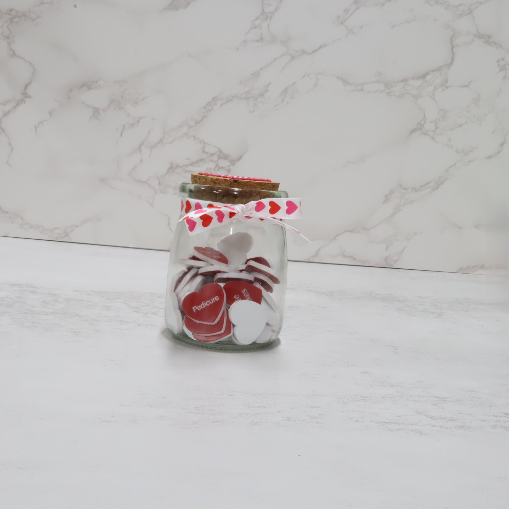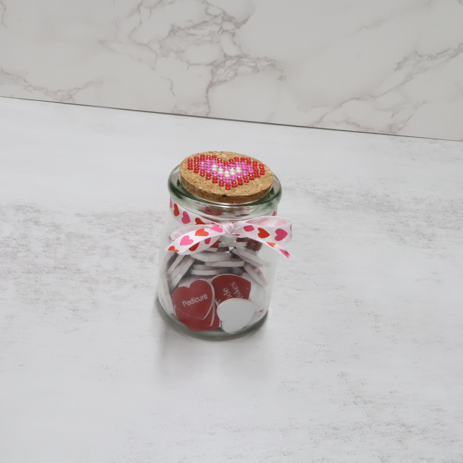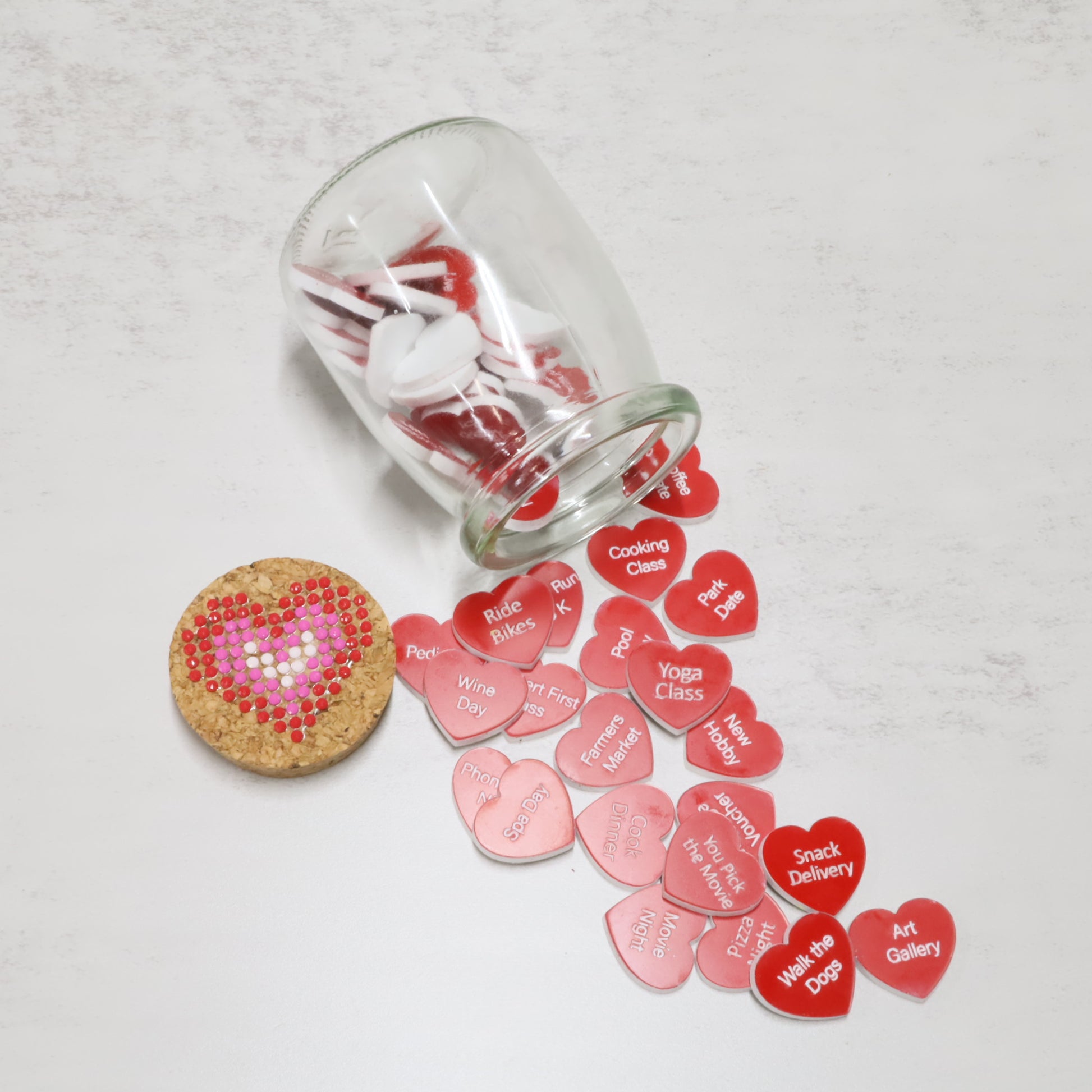Each jar includes 52 two-tone acrylic heart tokens, beautifully layered for a high-quality, modern look. Each heart is about an 1 inch.
