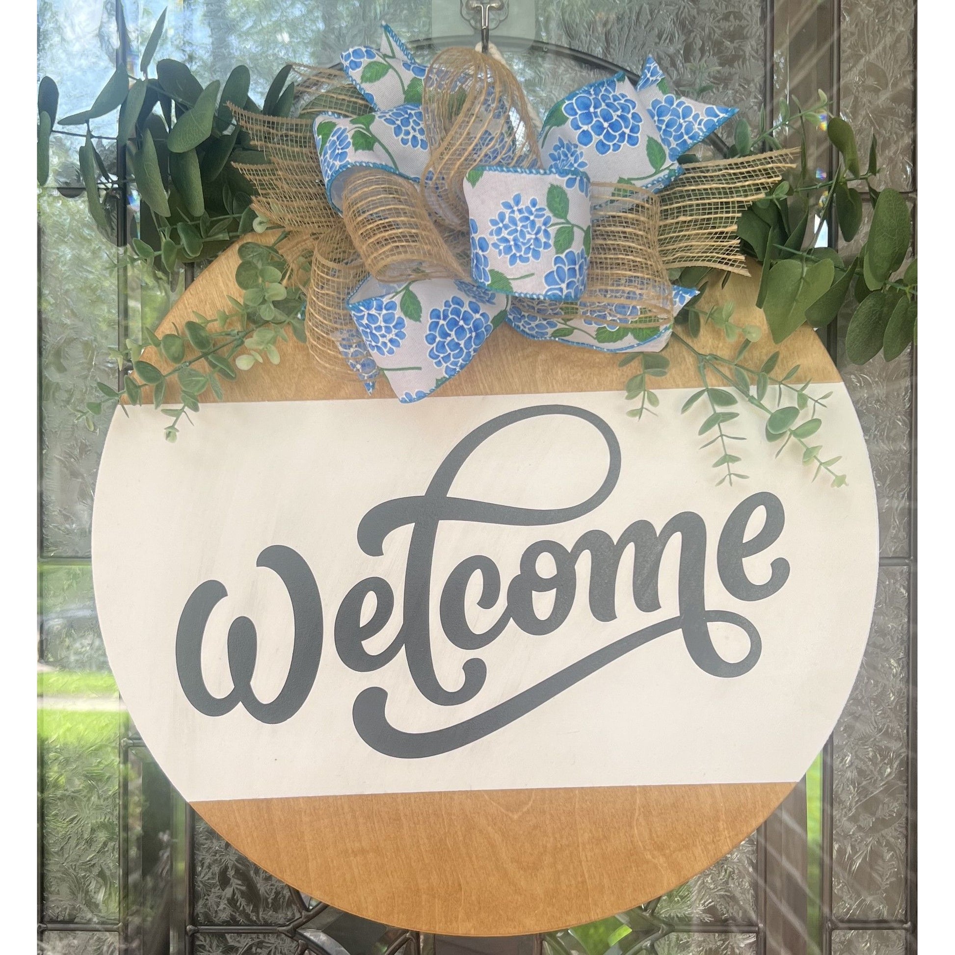 Bring cozy autumn vibes to your home with this charming handcrafted “Welcome door sign. A festive bow with details and rustic ribbon adds the perfect finishing touch, making it a standout piece that welcomes guests with warmth and cheer.