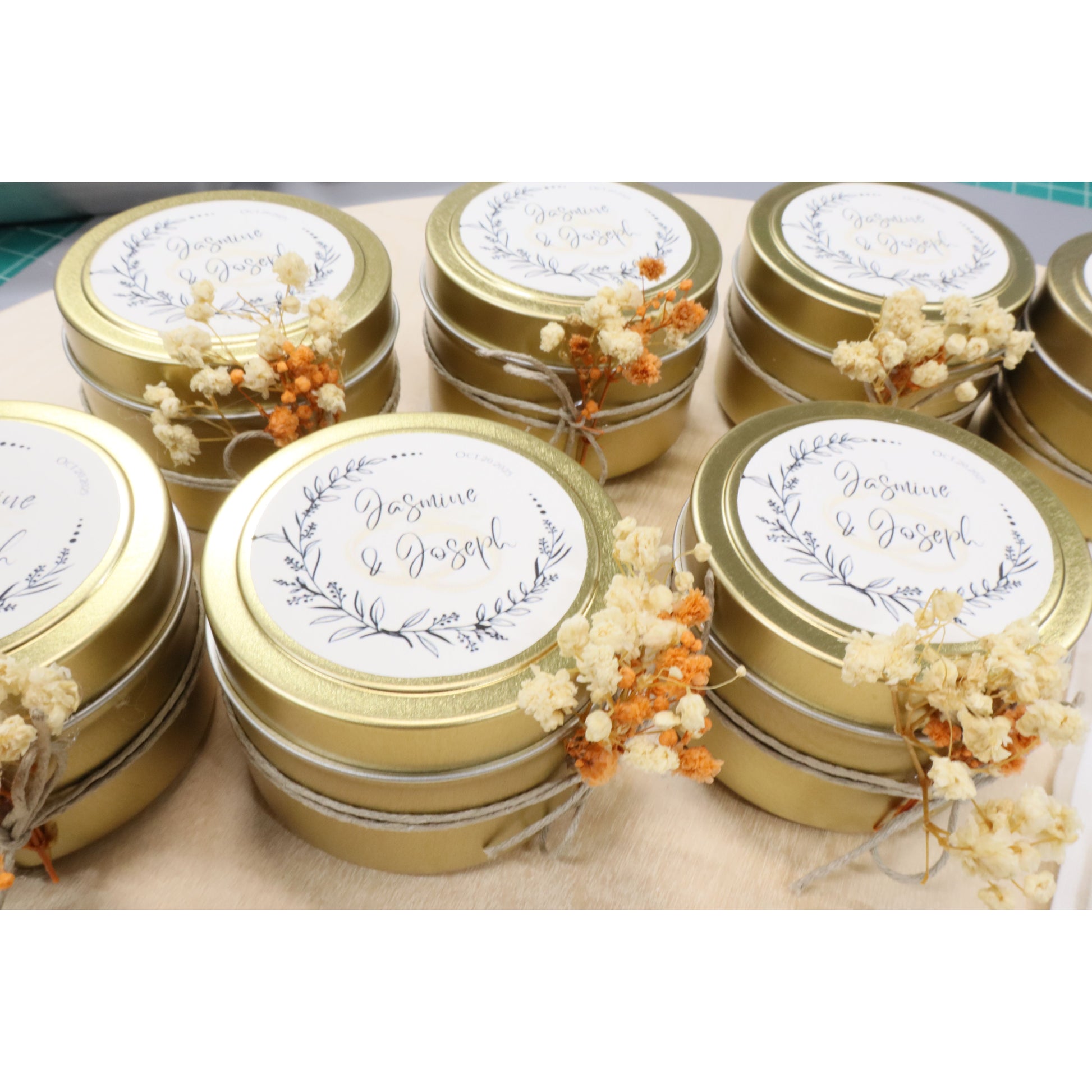 Each candle is decorated with dried flowers and finished with a personalized sticker that reflects your event’s theme. Customers upload their design inspiration, and we provide a proof for approval before printing.